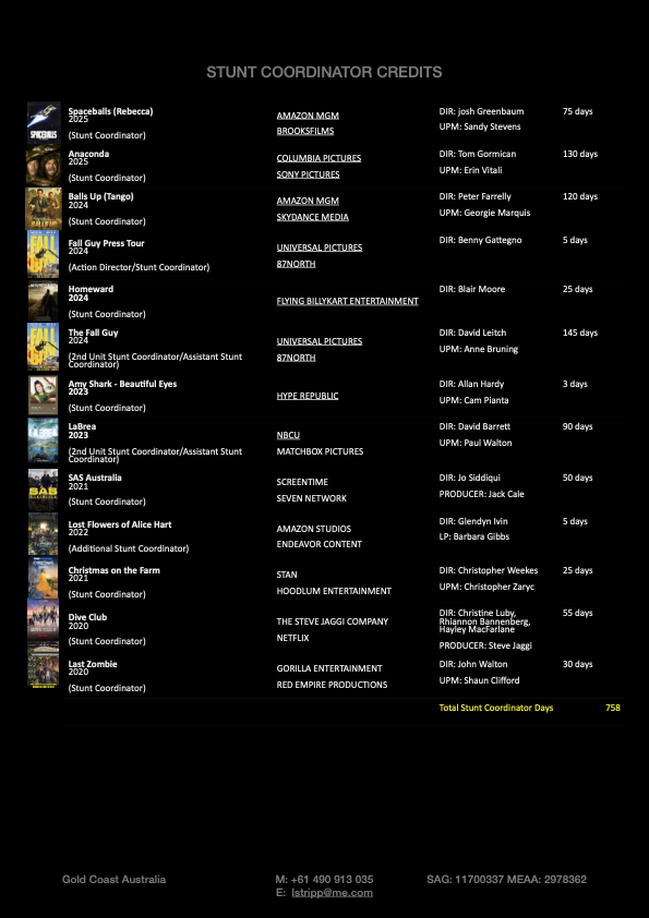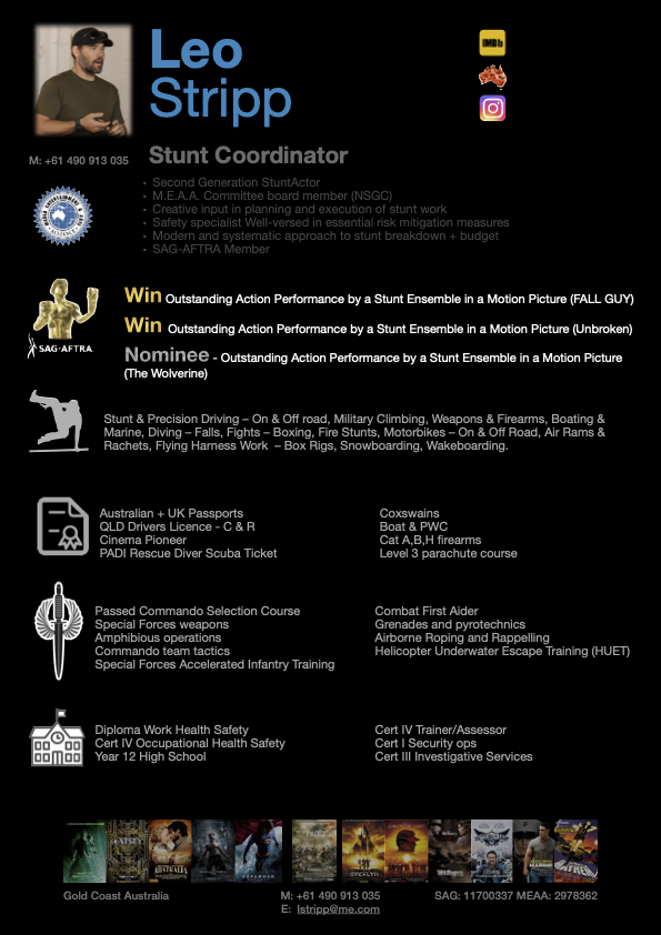 Stunt & Precision Driving—On & Off Road, Military Climbing, Weapons & Firearms, Rescue & Abseiling, Boating & Marine, Diving—Platforms & Springboards, Falls, Fights—Boxing, Fire Stunts, Footfalls, Gymnastics—Tramp, Motorbikes—On & Off Road, Quad Bikes, Air Rams & Ratchets—Jerk Backs—Deadman, Flying Harness Work, Rigging—Rope & Wire Work—Box Rigs, Snowboarding, Wakeboarding, Swimming & Scuba, Agile & Athletic.